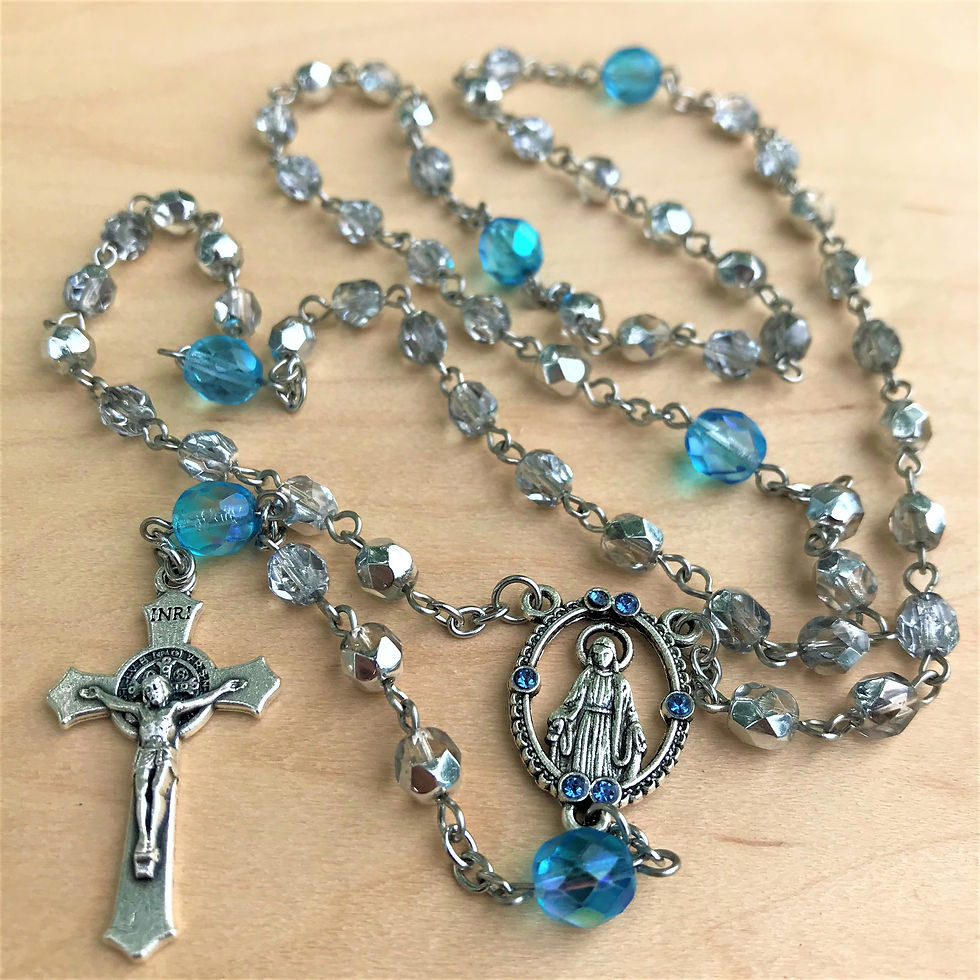 Czech Devotions, exclusive 5-decade rosaries handmade by Grant and Celeste in limited runs of seven, showcase the elegance and lavish color of Czech glass from the region of Jablonec nad Nissou, the heart of Czech glassmaking. They feature our signature stainless steel chain and couplings, Italian-made centers and crucifixes, and our lifetime warranty. All our rosary prices include USPS First Class domestic shipping.