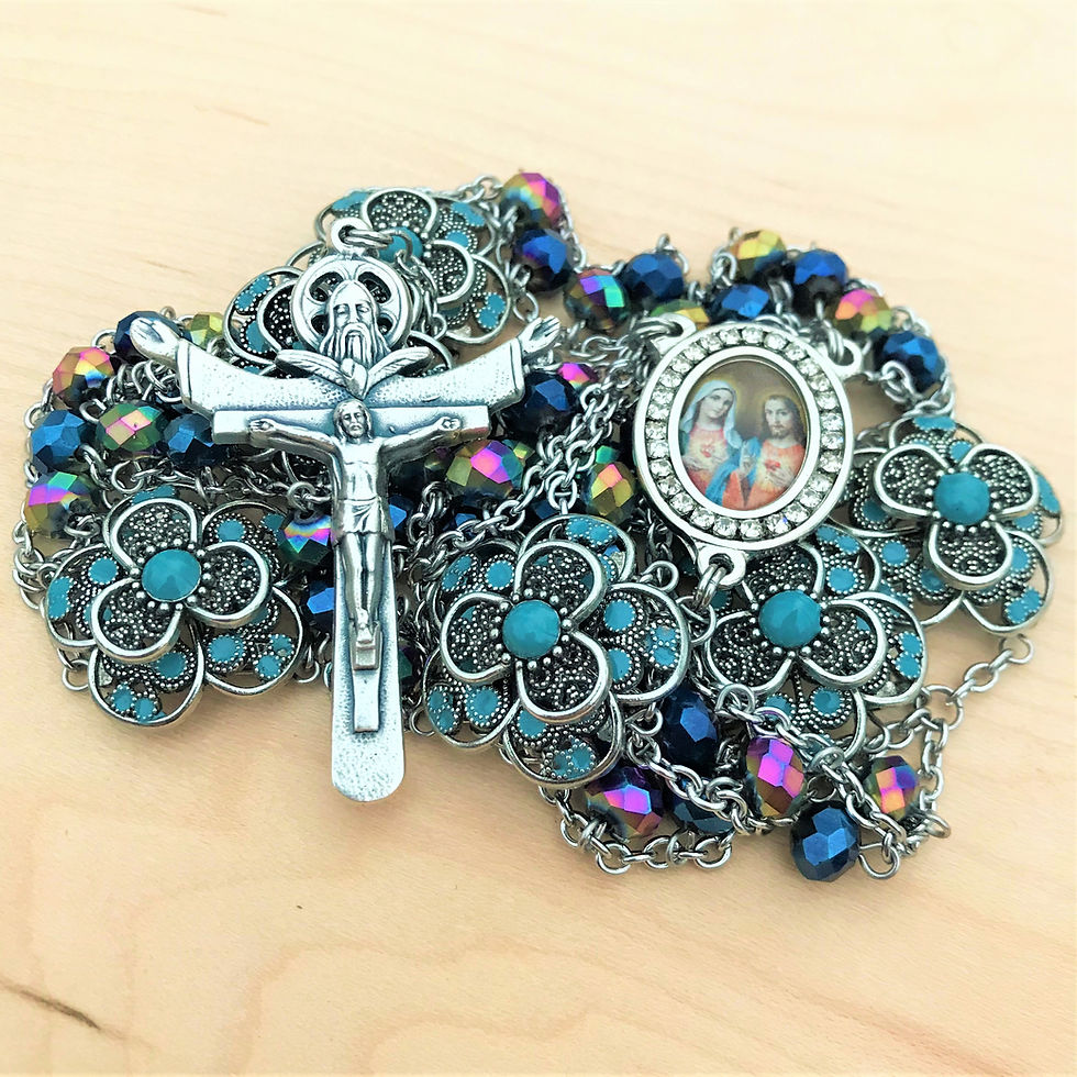 These rosaries are cathedrals to prayer---designed for use and crafted to reflect the beauty of your prayers. The ladder rosary is based on the visions of both Saint Dominic and Saint Francis de Sales, in which they saw the rosary as a ladder leading to Heaven. The stepped beads rotate under your fingers as you work your way through the Hail Marys, and it is a uniquely pleasing way to count through the decades.